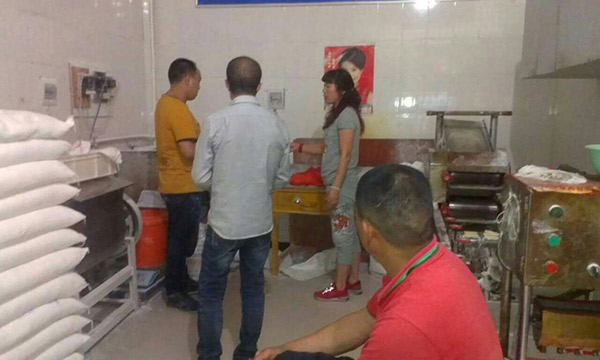工作人員在給重慶的三位客戶講解面條機(jī)的流程